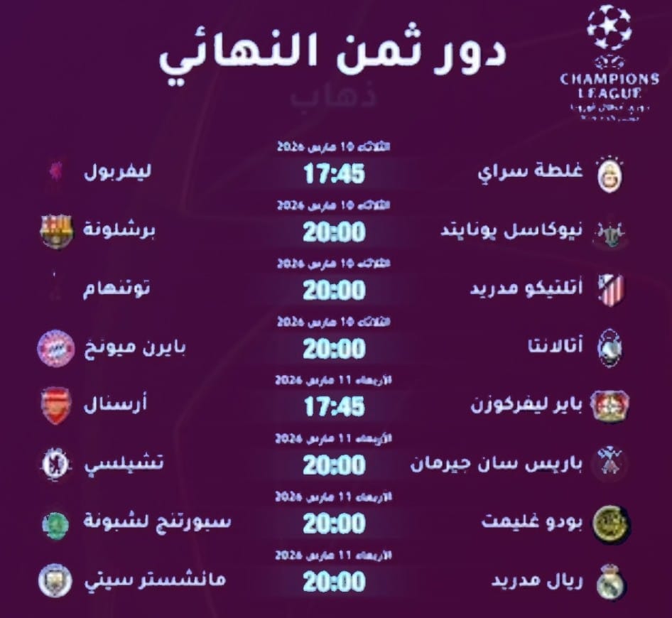 تنطلق على مدار يومي الثلاثاء والأربعاء العاشر والحادي عشر من مارس 2026، مباريات الذهاب في دور ثمن النهائي من دوري أبطال أوروبا، في موعد مع ثماني مواجهات مشحونة تجمع نخبة الأندية القارية.